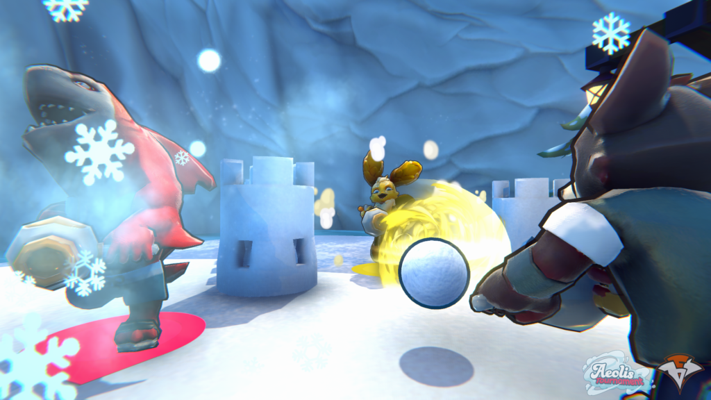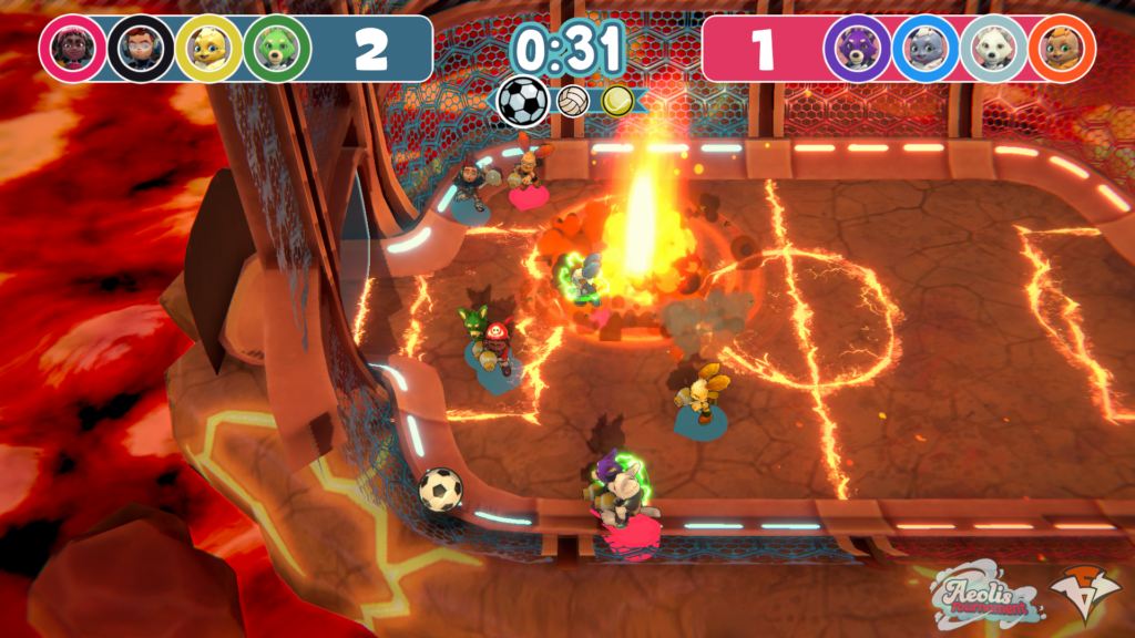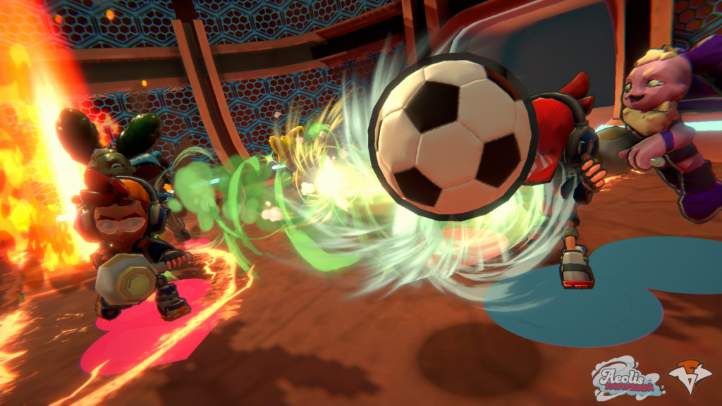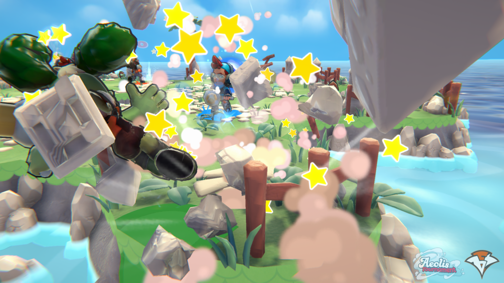 Aeolis Tournament is a 3D party action game where up to 8 players compete in various game modes based on a simple one-button mechanic. Characters use an air cannon to control the power of the wind and affect their surroundings. It's a high-tempo game in the vein of Fusion Frenzy with a Nintendo-inspired cartoony and colorful art direction.