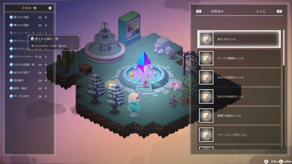 By placing things on the sky island, you can gain various powers that will be useful in your adventures. You can expand the island as much as you like and place as many things as you like, so there is no limit to how much you can expand. You can create your own island and build your own character to your heart’s content.