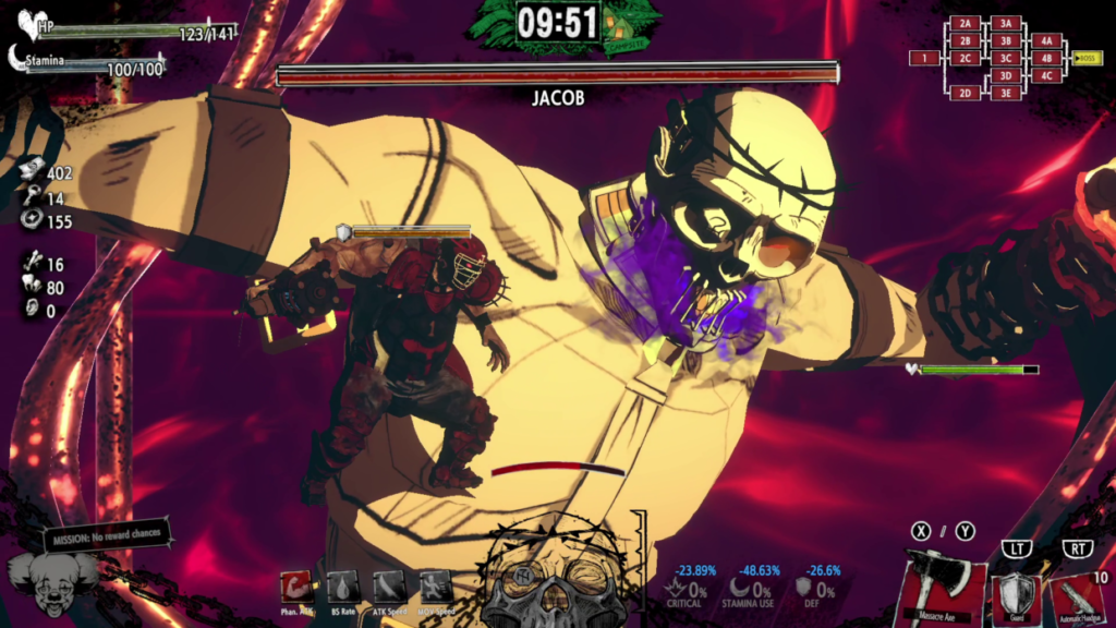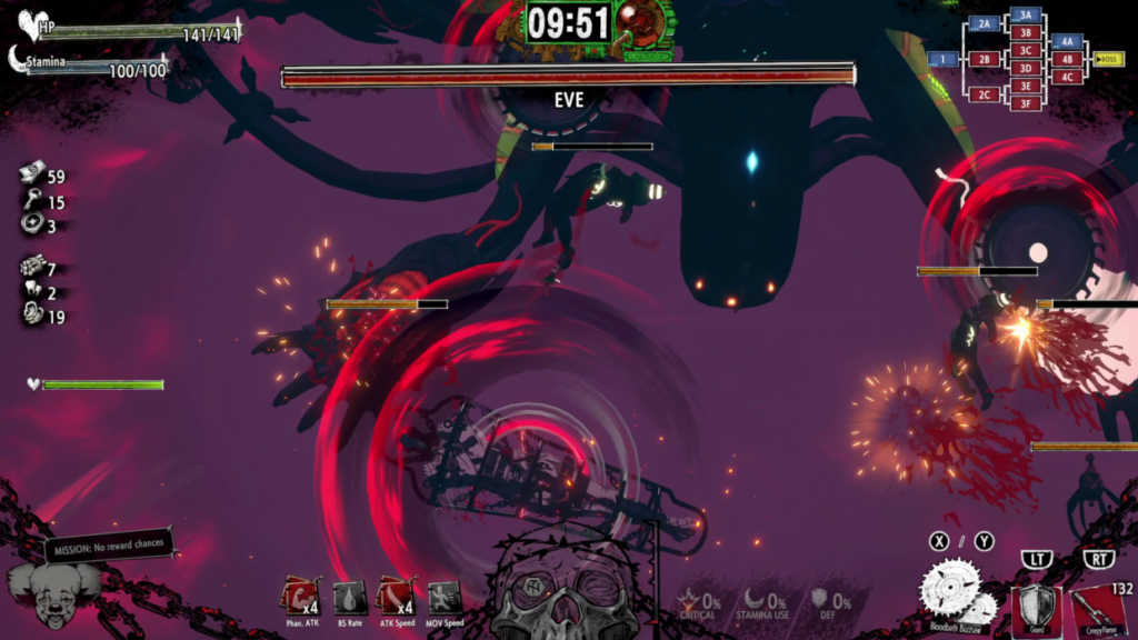 As you cut your way through enemies and bathe in their blood, your abilities will get stronger...but the blood will dry up over time, so you need to keep attacking. Keep an eye on the skull gauge at the bottom of the screen: once your bloodbath reaches its zenith, you'll be able to activate a powerful "Carnival Awakening" super attack!