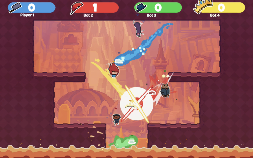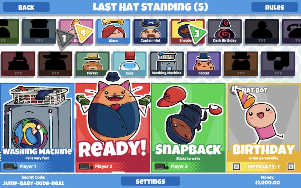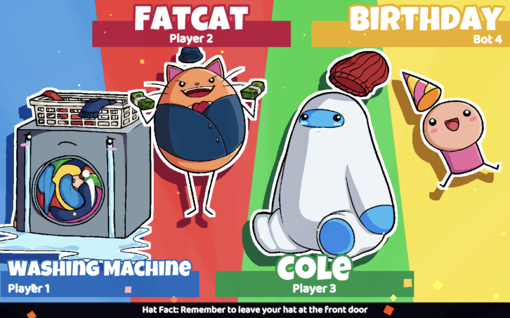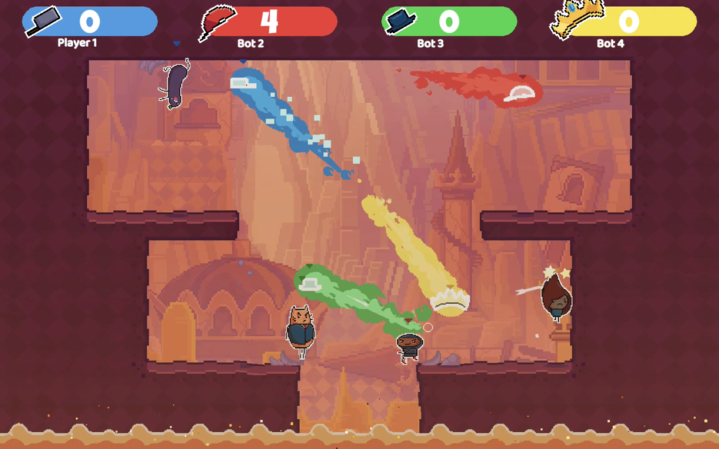 King of the Hat is a 2-4 player 2D party platformer where you fight with a hat! Throw your hat to attack, defend and bait opponents. But watch out! If someone jumps on your hat ... you die!