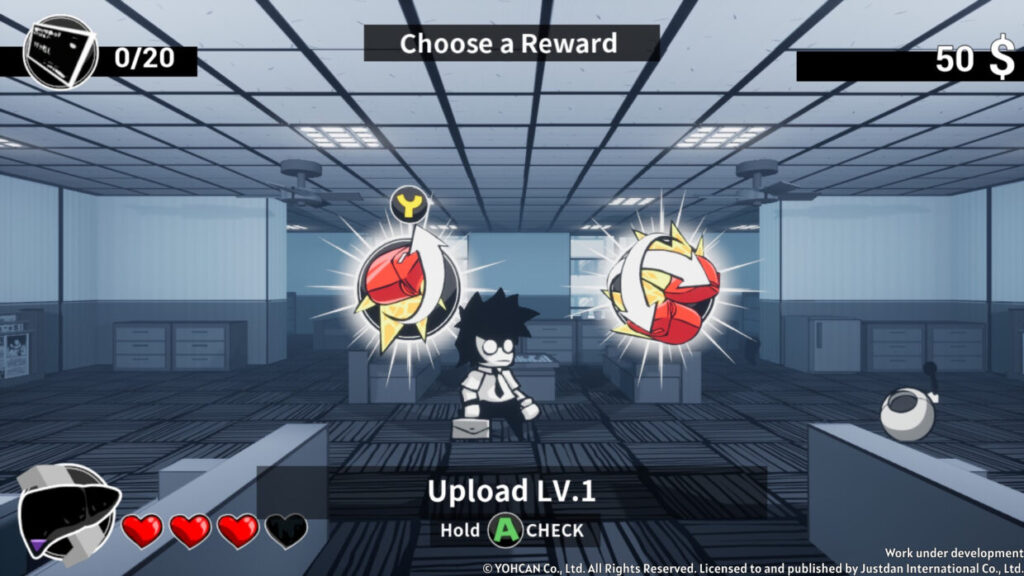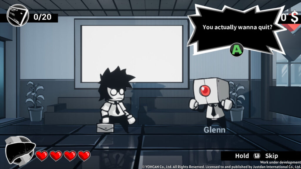 “Quit Today” combines side-scrolling beat 'em up action with roguelike where players can experience a unique combination of skills during their journey. Players can use the briefcase as a weapon to strike colleagues or use it to defend against their attacks. With each victory, players can choose to enhance their skills from a skill pool. The diverse skill selection allows players to select various gameplay styles which best suits the player during their playthroughs.