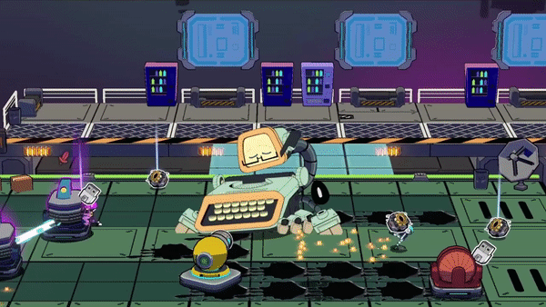 Omniland was once a model city where gigantic gadgets took care of people... until someone spilled a cup of coffee on the server controlling all of the mammoth machines. Before you can clobber a colossal typewriter, you'll need a weapon. Craft weapons by building factories and processing materials on the battlefield.