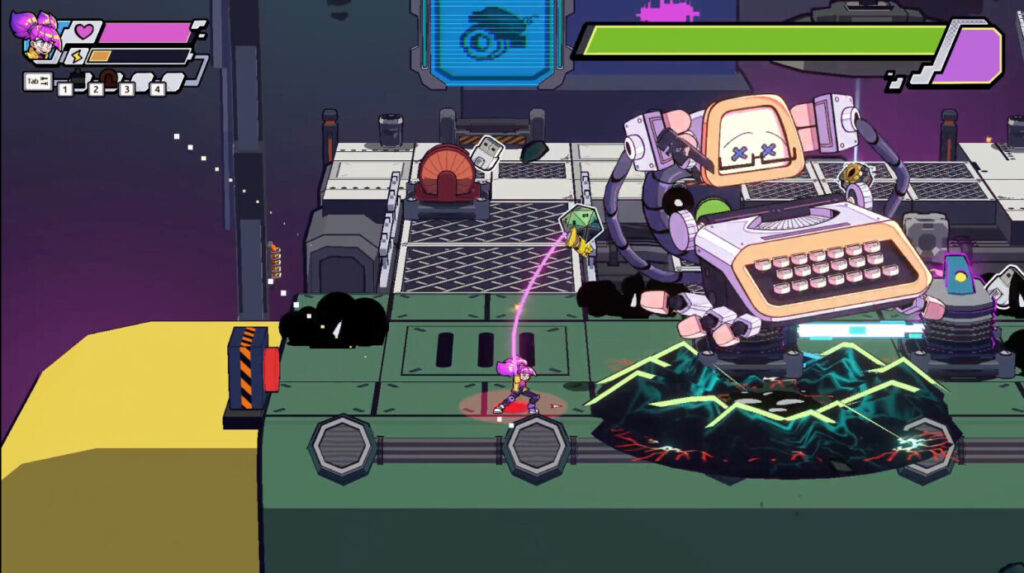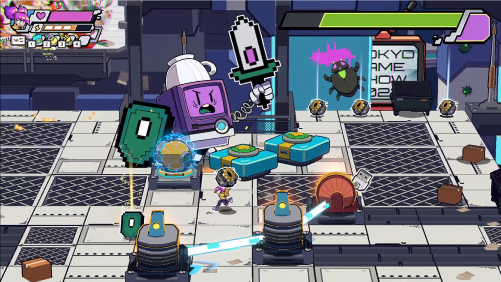 Challenge grumpy game consoles alone or build a maze of machines with a buddy in two player co-op.