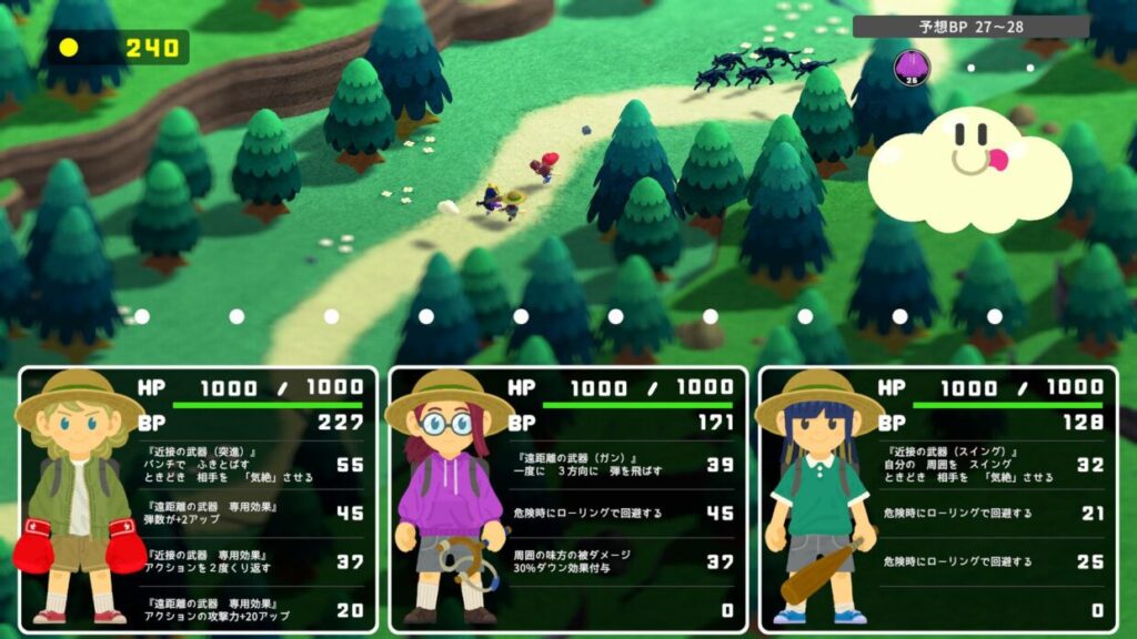 Three player characters move and fight automatically by AI.