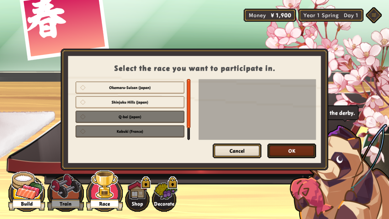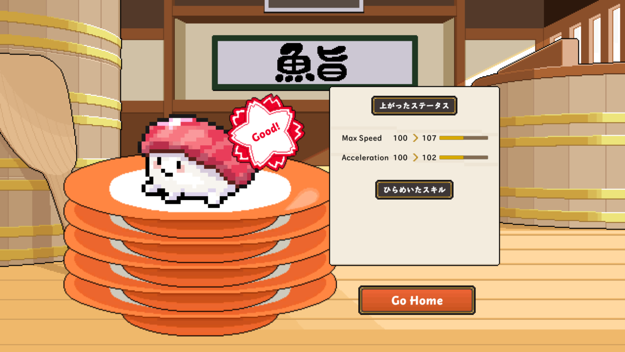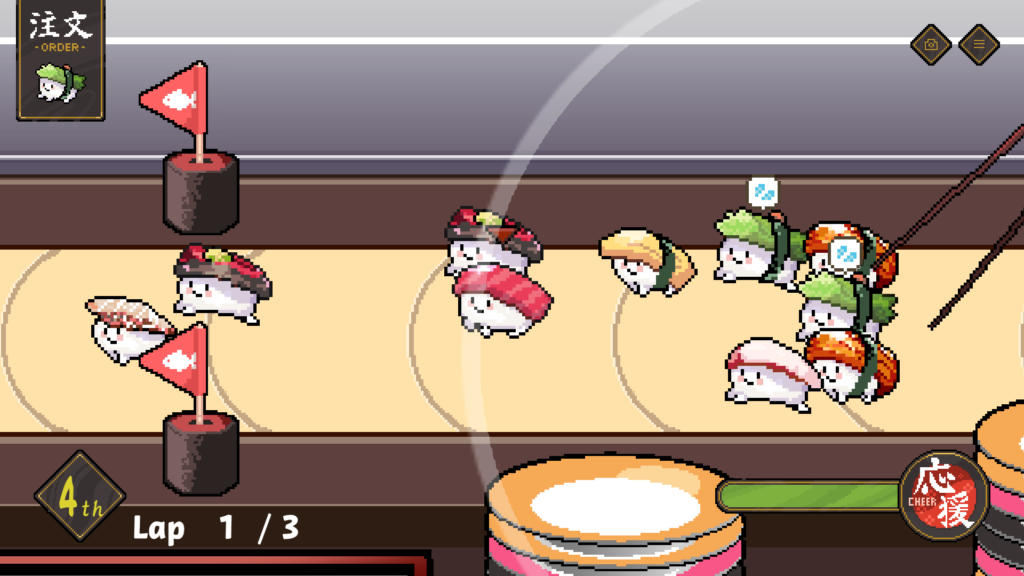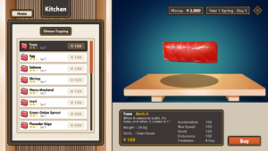 Winning races and leveling up your sushi ingredients or purchasing cooking tools from the shop will increase the types of ingredients you can prepare and make your sushi even stronger.