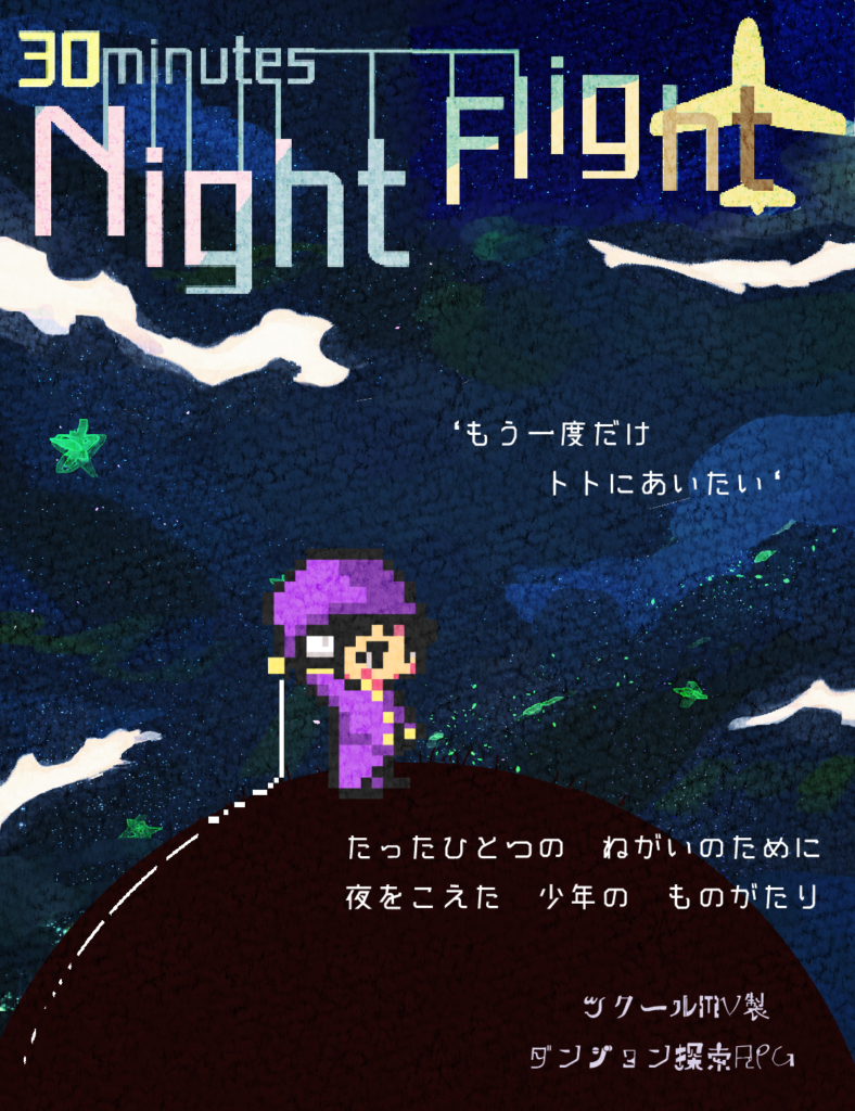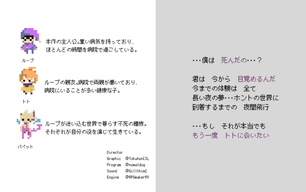 ゲームリストに戻る 30minutes Night Flight by 17 for PCPC - Not Steam タイプ RPG DESCRIPTION ◆PC用フリーゲーム「30minutes Night Flight」(by 17) 君は今から 目覚めるんだ 今までの体験は 全て 長い夜の夢 ホントの世界に 到着するまでの 夜間飛行 死んだはずの主人公ループは、目覚めたら舞台の上にいた。 記憶を失ったループは、親友だと語るトトと出会う。 「もう一度会って ともだちになろう」 親友だったトトを探すため、ループは旅に出る。 あやつる×ダンジョン探索RPG 「パペット」をあやつってダンジョンの奥へ進むのが君の目的。 全ての敵「パペット」は、君の力になるだろう。 RPGツクールMV製 ダンジョン探索RPG For Windows / フリーウェア(無料) 発売日 未定 ブース番号 未定 VISIT WEBSITE
