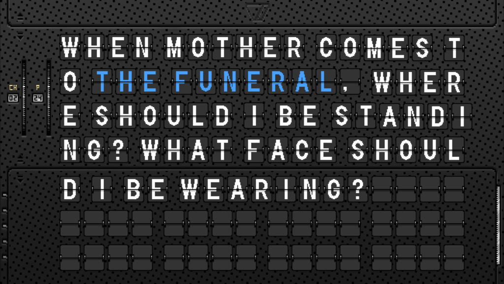 The Wakeは、祖父の葬儀の3日間のうちに開かれた過去の傷口——罪悪感の根源を綴った日記帳です。そこには祖父から息子、孫の三世代の、もつれあった感情と思い出が記されています。日記には単純な置換式の暗号化が施されています。暗号を解読して日記に秘められた本音を暴くうちに、作者の人生における矛盾が露呈するでしょう。