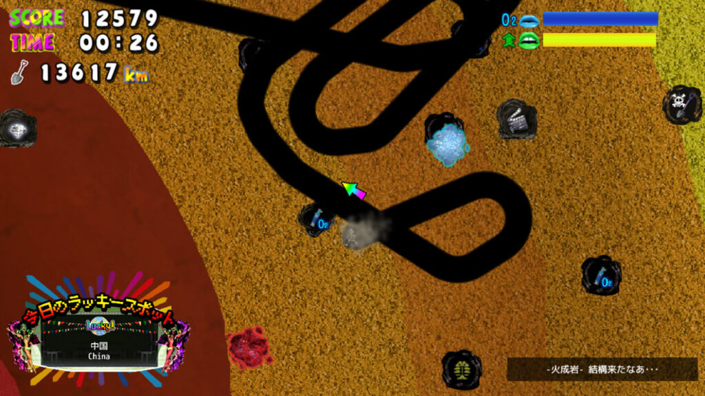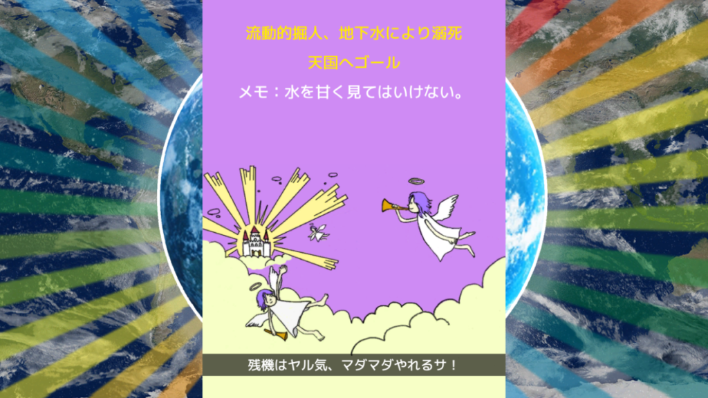 空腹や酸素ゲージが0になったり、マグマに触れて天国や地獄にゴールしないようにうまく掘り進んで地上に出よう!