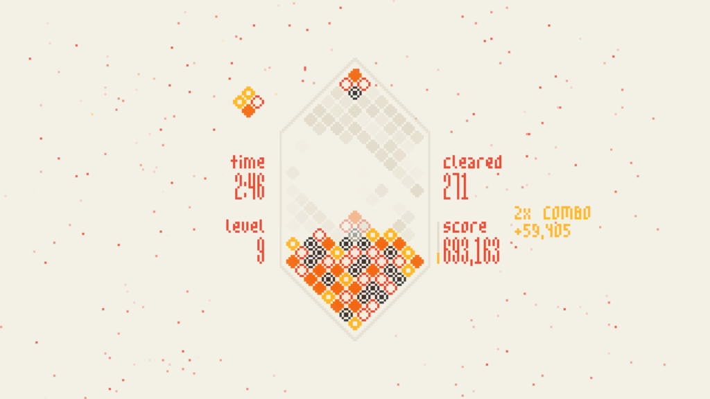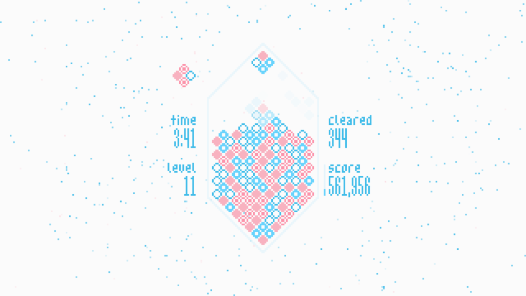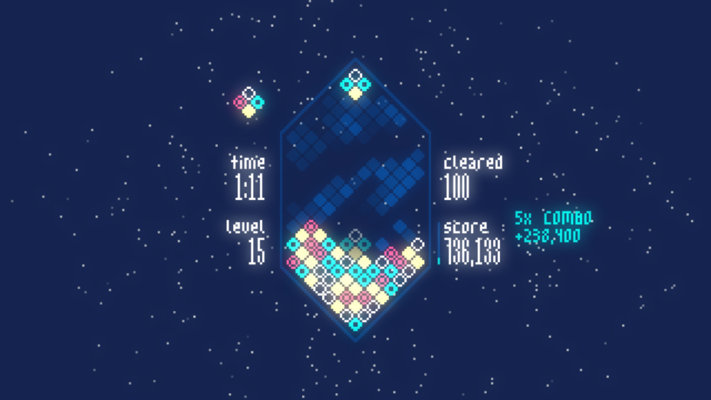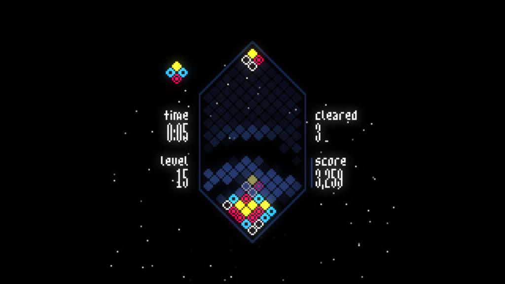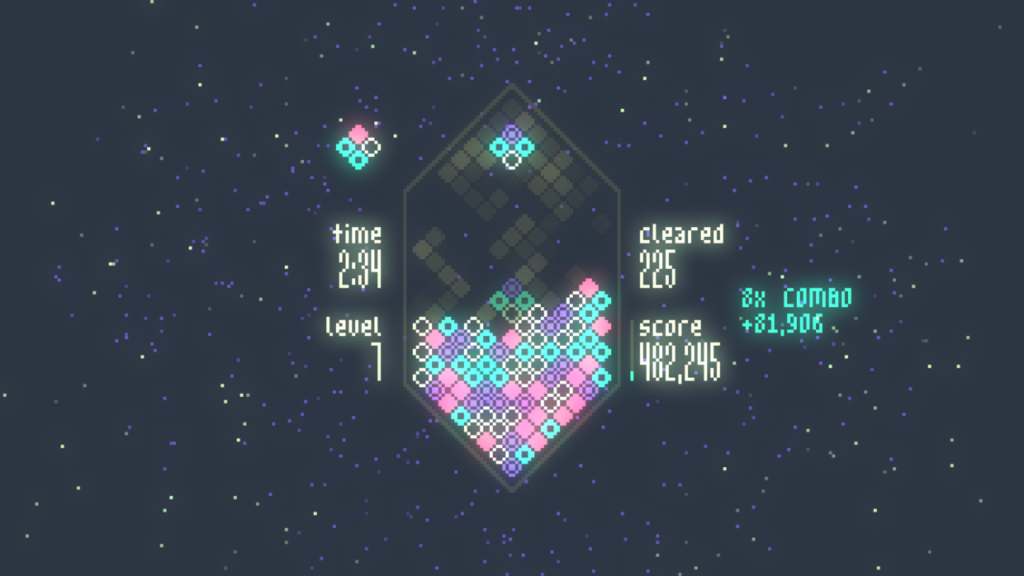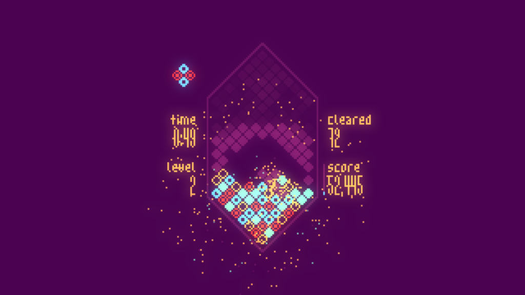 Mixolumia introduces a fresh twist on falling block puzzlers. Scintillating visuals and entrancing music respond and evolve as you play. Diamond blocks slide together on a gem-shaped board and explode in glittering chain reactions.