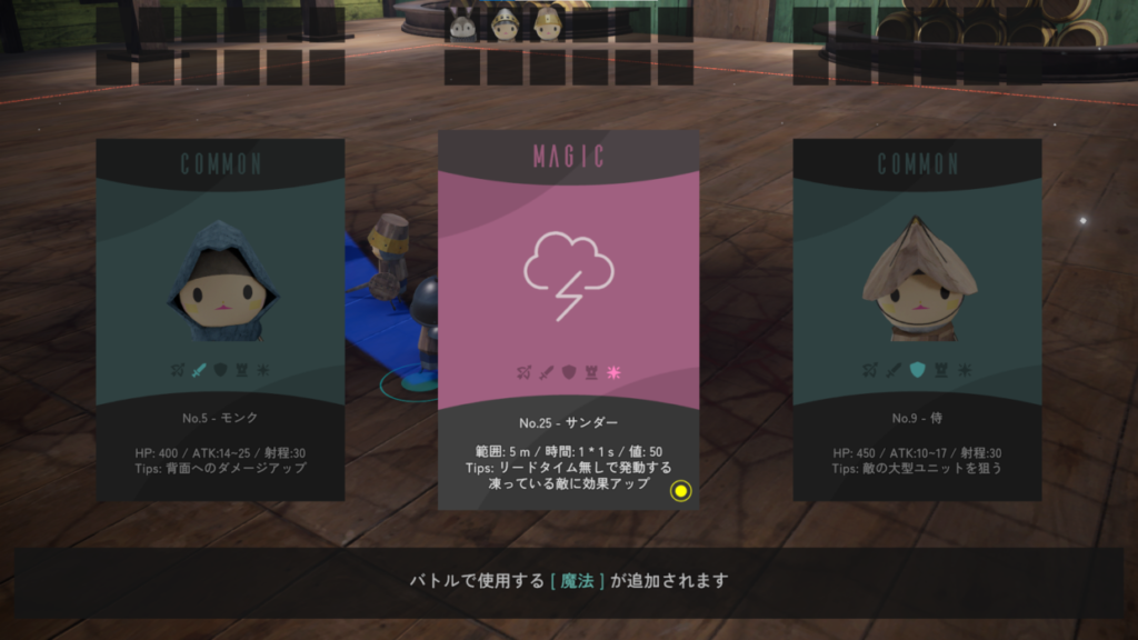 盾役の「ナイト」、攻撃役の「ウィザード」、後方から爆弾を発射する「大型ユニット」など多彩な仲間と魔法が獲得できます。