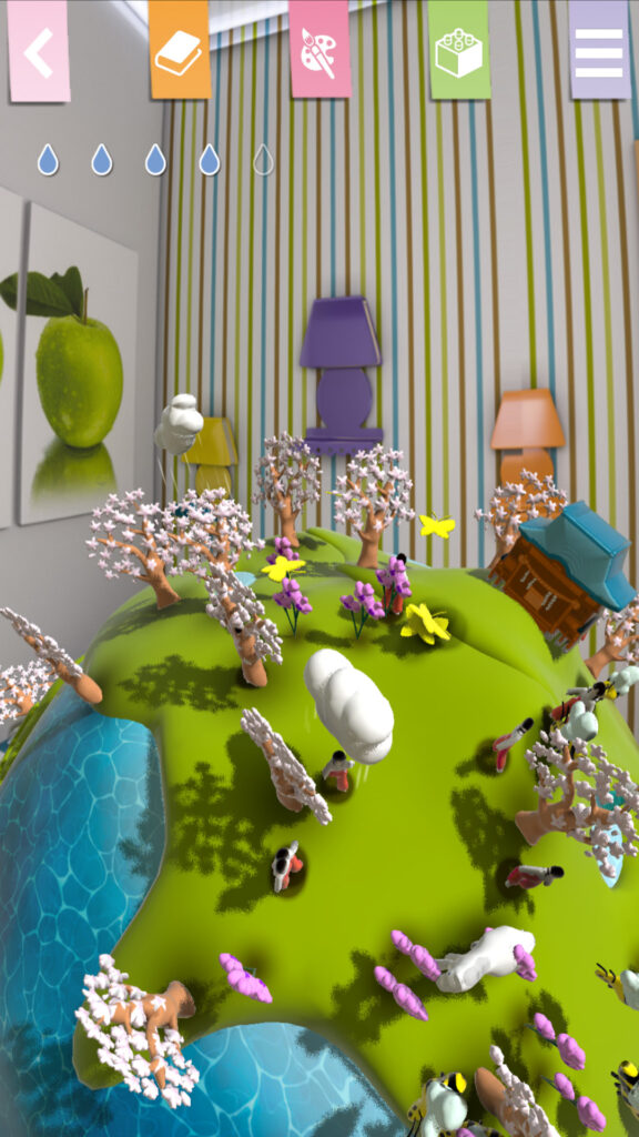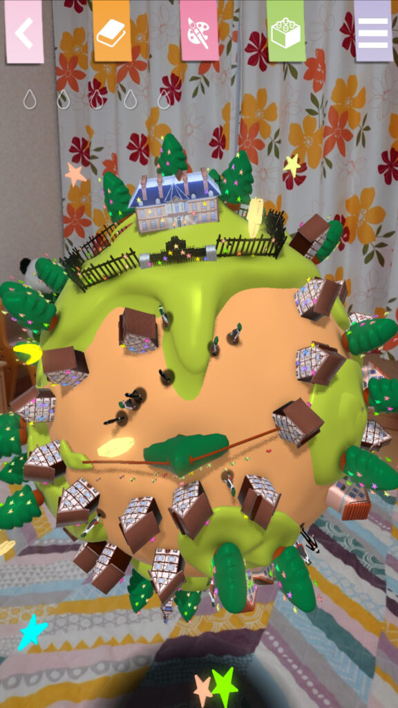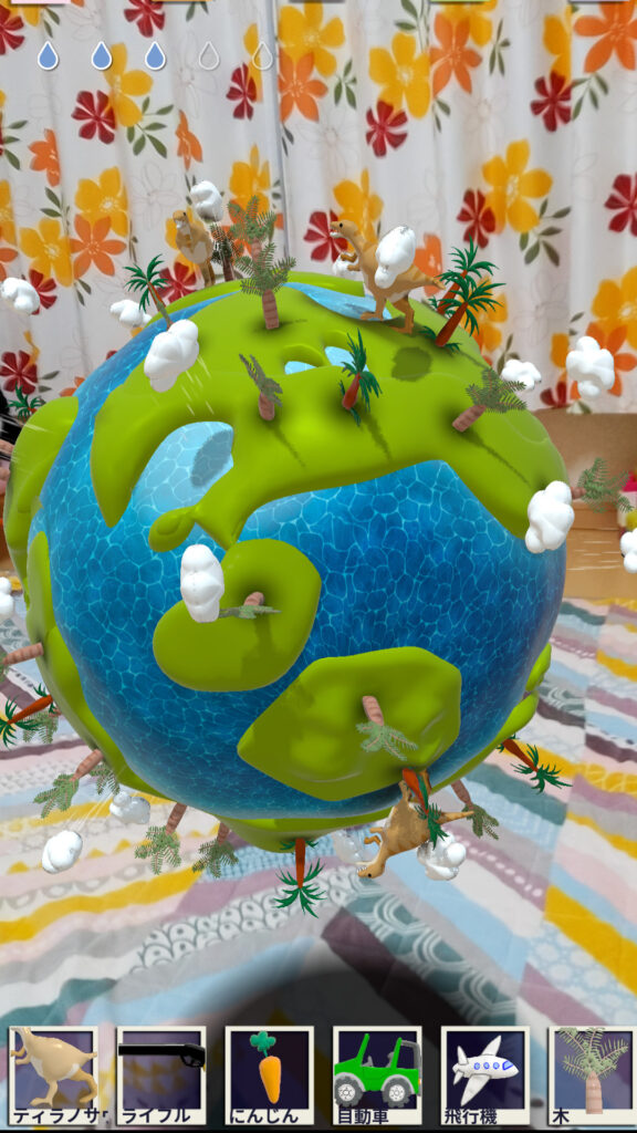 AR(拡張現実)はカメラを使い、現実の風景とデジタル世界を融合する技術です。ARモードを使うと、小さな惑星が実際に目の前に浮いているように見えます。