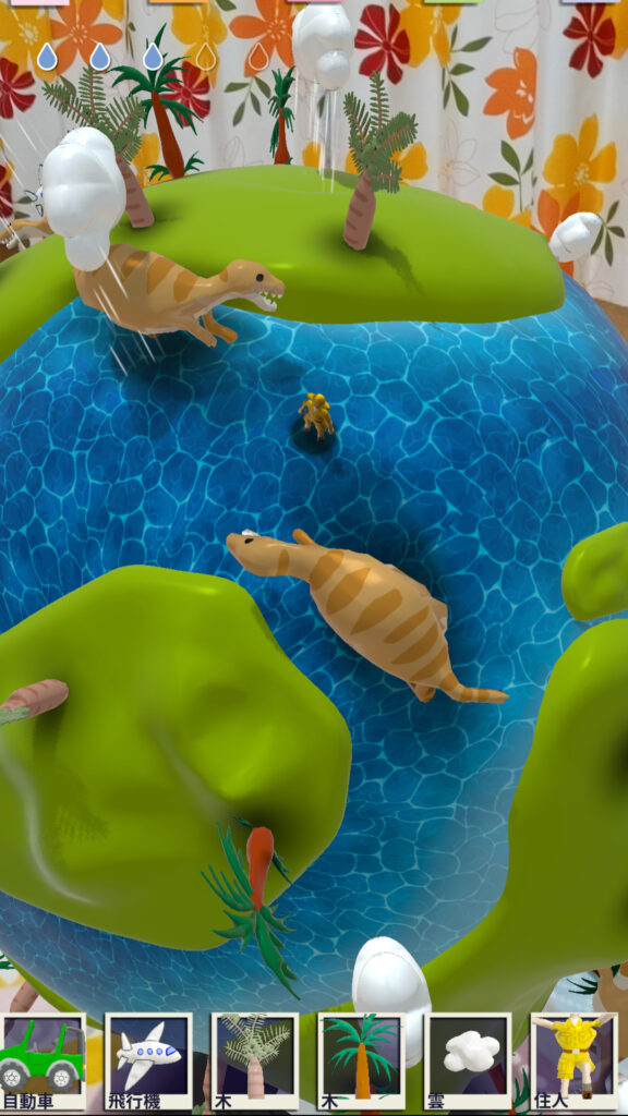 『TOYFORMING』は絵を描いて小さな惑星をテラフォーミングする惑星シミュレーションゲームです。アプリ上で絵を描くと、AIが自動で何が描かれたかを判定します。絵は立体化されトイとなり、直径60cmの小さな惑星の上で動き出します。雲は空に浮かび雨を降らせ、恐竜は地上を闊歩します。さまざまな絵を描いて、惑星上に配置し、あなただけの惑星を作ってください。