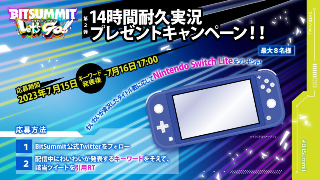 「わいわい」がゲーム実況したタイトル数に応じてNintendo Switch Liteを最大8名様に1台ずつプレゼントするツイッターフォロー&RTキャンペーンをBitSummit公式Twitterにて開催!