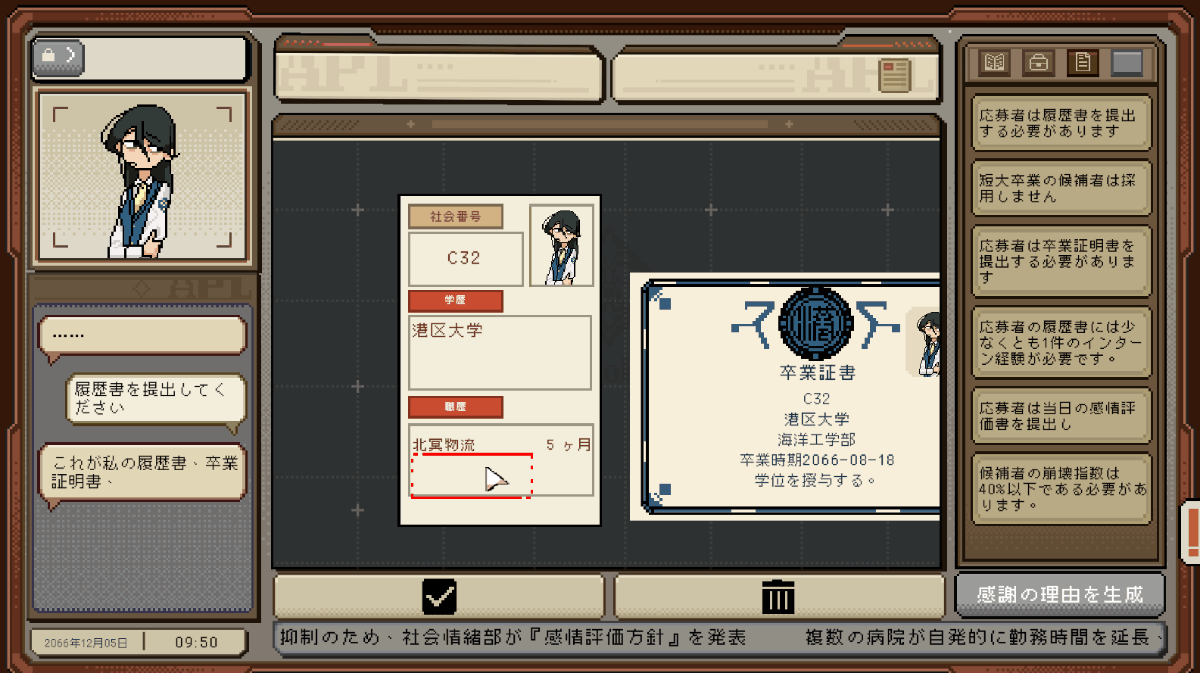 応募者たちの感情評価書を確認し、精神的に安定した従業員を求めます。