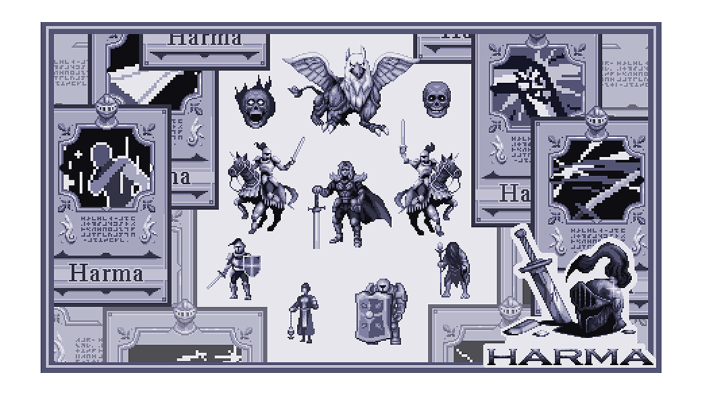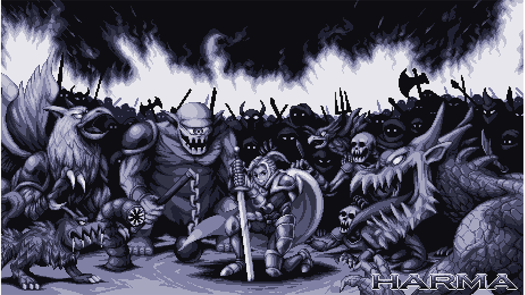 HARMA is a deck-building card game that expresses a dark fantasy with eight-color pixel art.