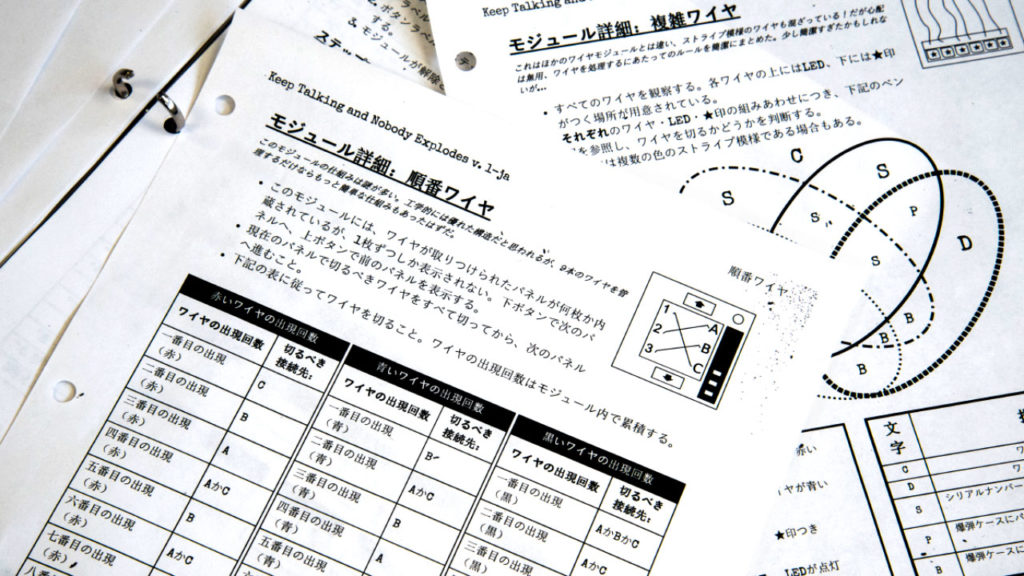 「分析担当者」は爆弾の解除方法を現場に伝える。 まず、手元にある<爆弾解除マニュアル>を見ながら、処理担当者の情報から爆弾に仕掛けられたモジュールを特定する。そして、その解除方法を正確に現場へと伝えるのだ!