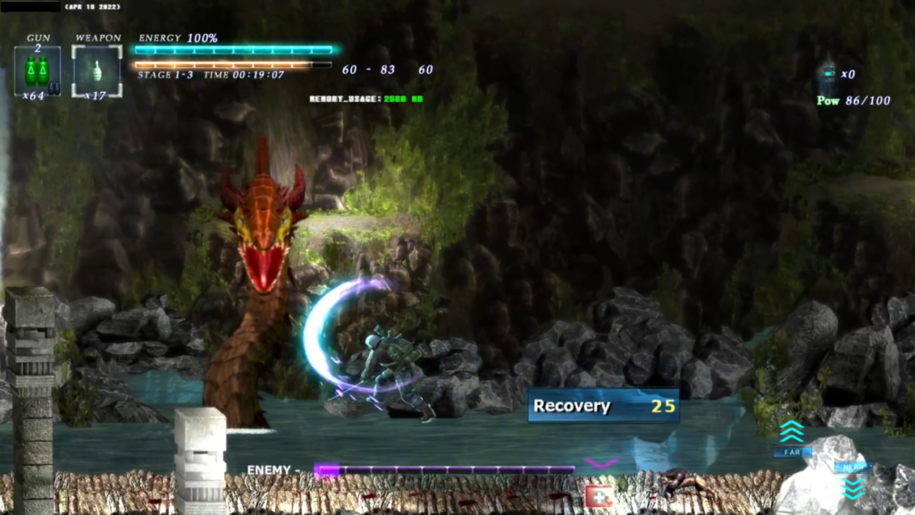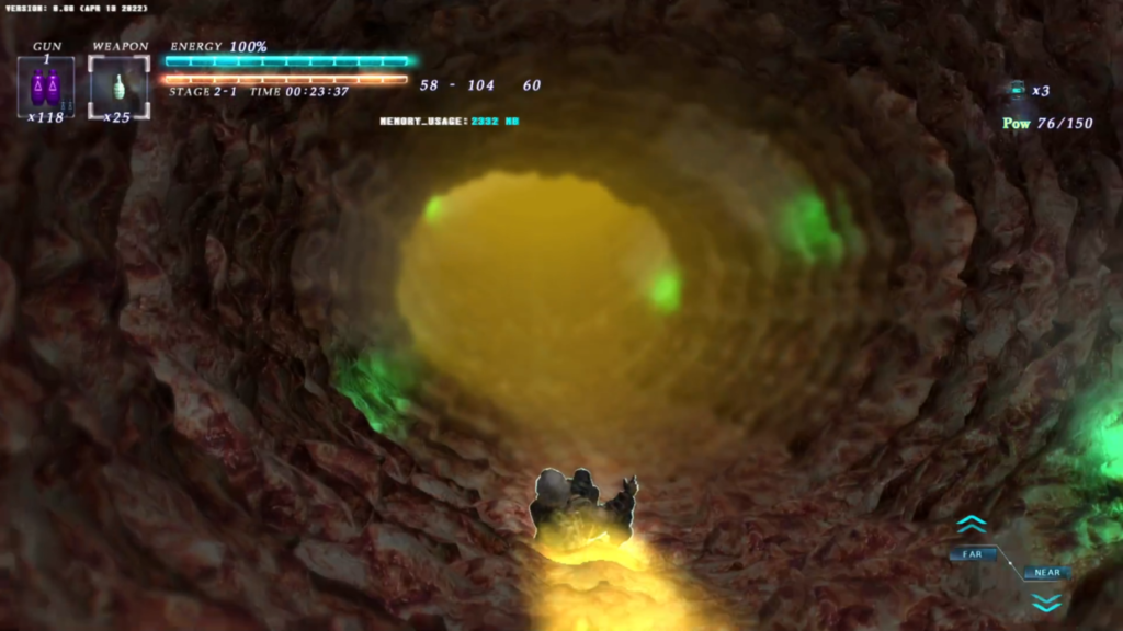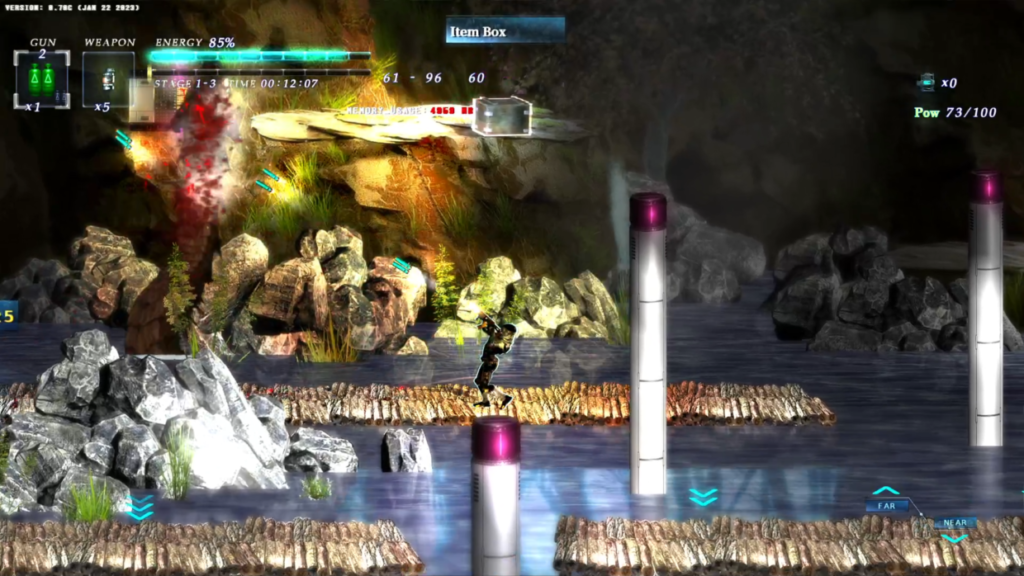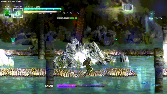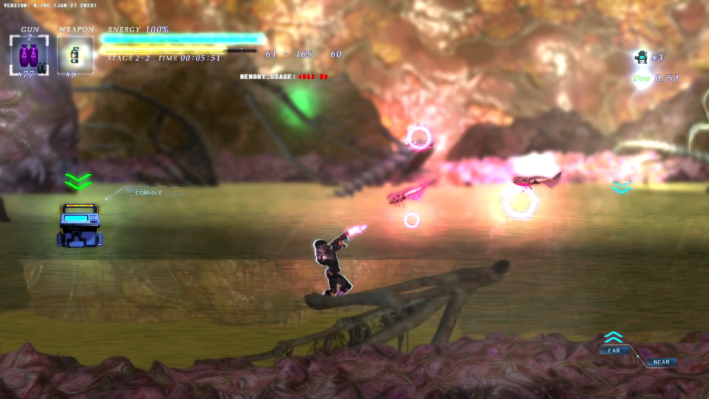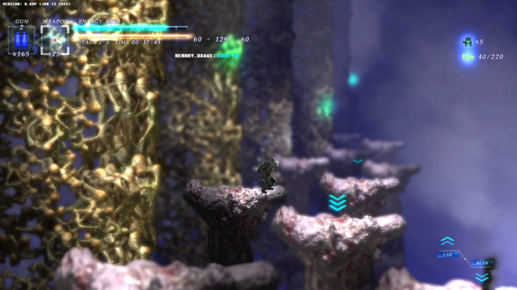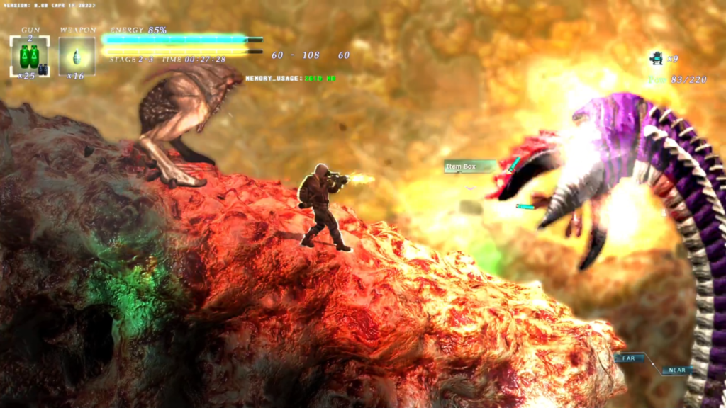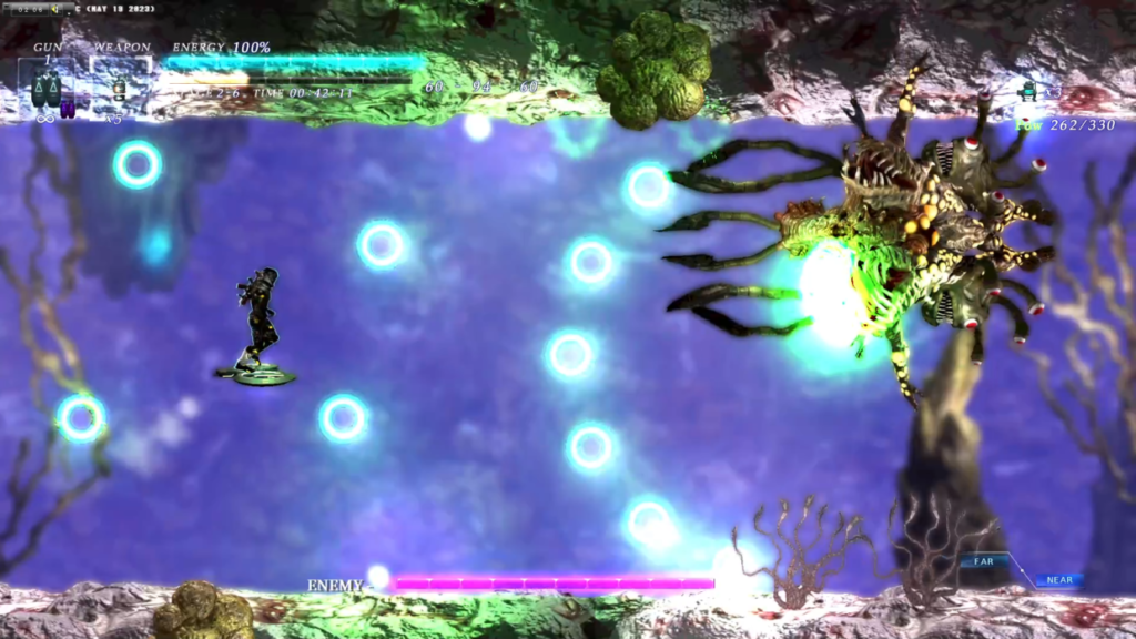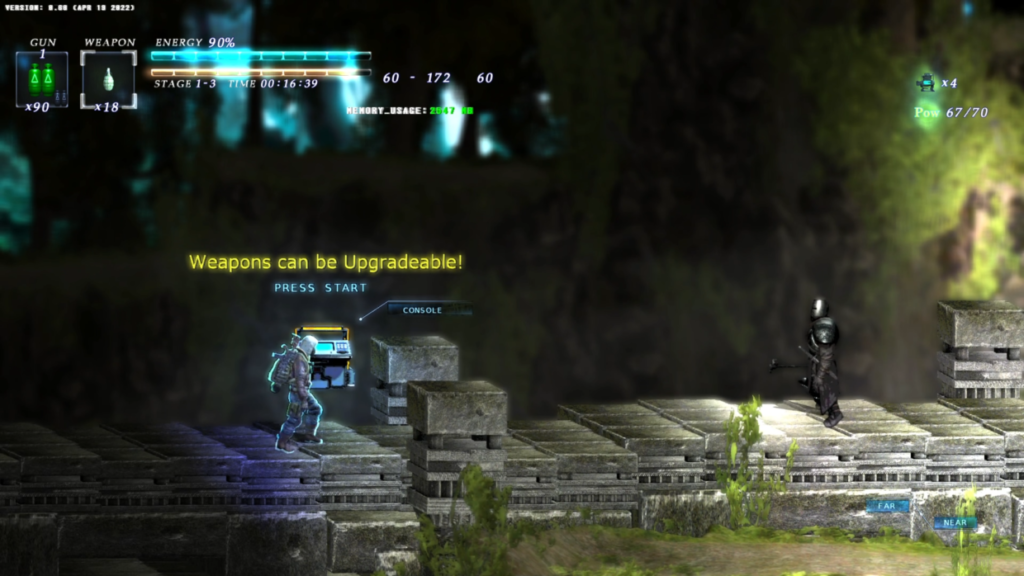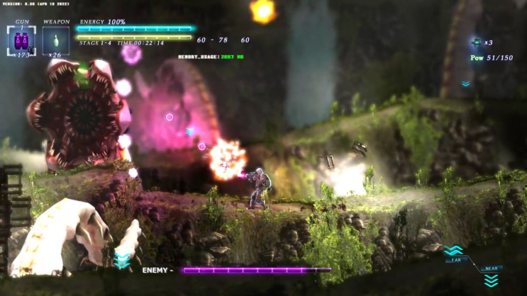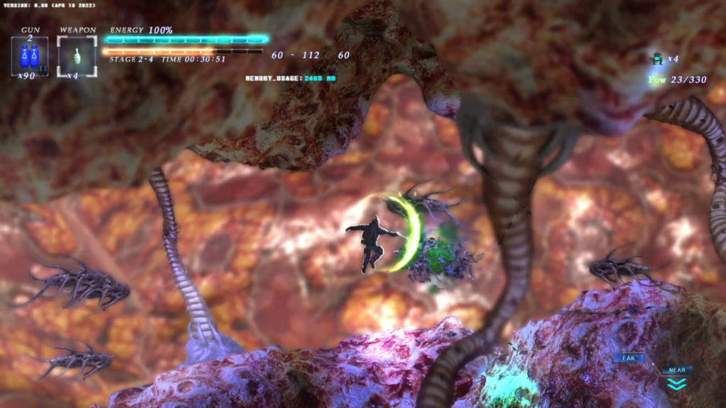 XEARZは2D横スクロールプラットフォーマーです。手前と奥に移動可能なマルチラインが特徴。近接武器のブレード、誘導弾や反射弾など様々な銃、手榴弾や火炎弾などサブウェポンを駆使し敵を倒す。武器類は強化可能。3Dムービーが流れ物語が進む。AIに纏わるSF哲学ストーリー。